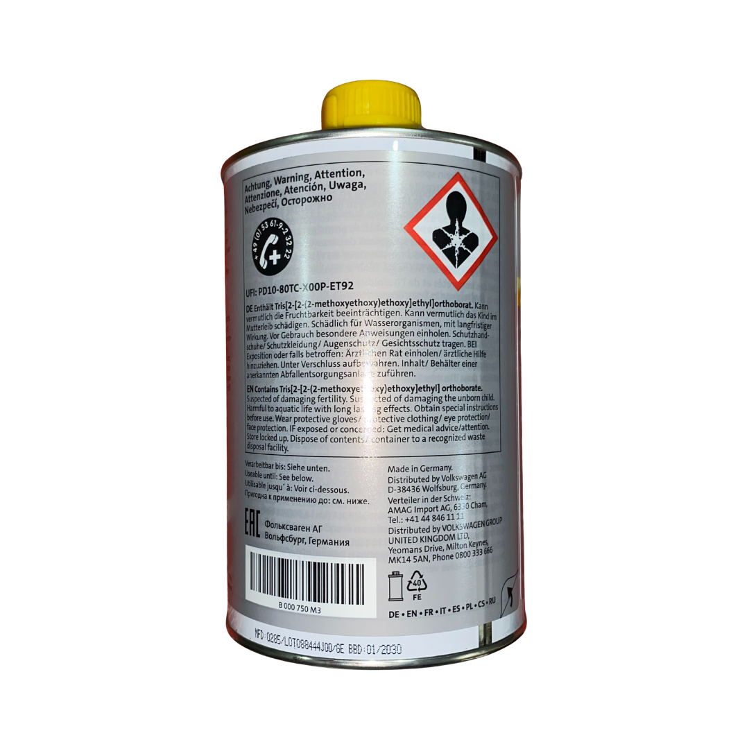 El líquido de frenos DOT 4 original del Grupo Volkswagen, referencia B 000 750 M3, es un fluido hidráulico premium diseñado específicamente para el sistema de frenado de vehículos VAG (Volkswagen, Audi, SEAT, Škoda). Este fluido cumple con la norma VW-NORM 501 14 y está formulado para mantener un alto rendimiento de frenado en condiciones exigentes, ofreciendo estabilidad térmica superior, resistencia a la degradación y protección anticorrosiva para componentes críticos como bombas, cilindros y líneas de freno.